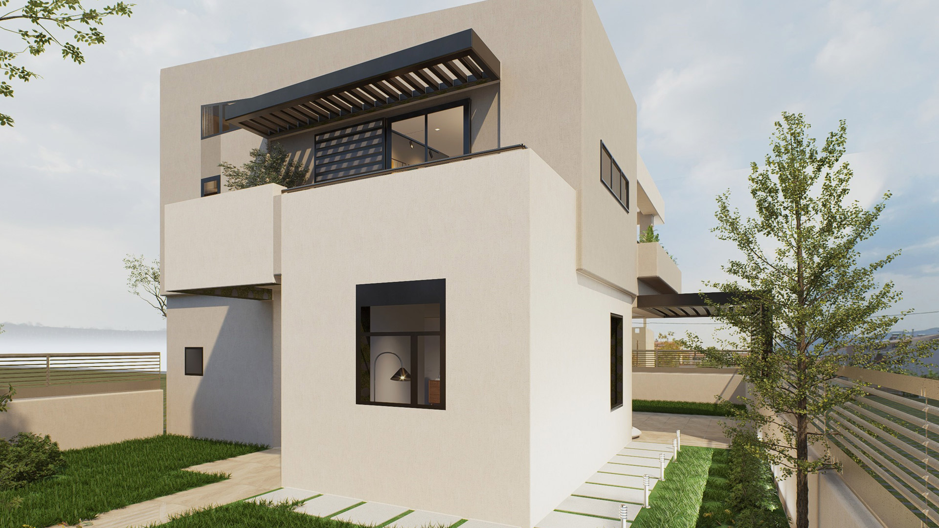 • Σχεδιασμός σύγχρονης διώροφης κατοικίας με καθαρές γεωμετρικές μορφές.
